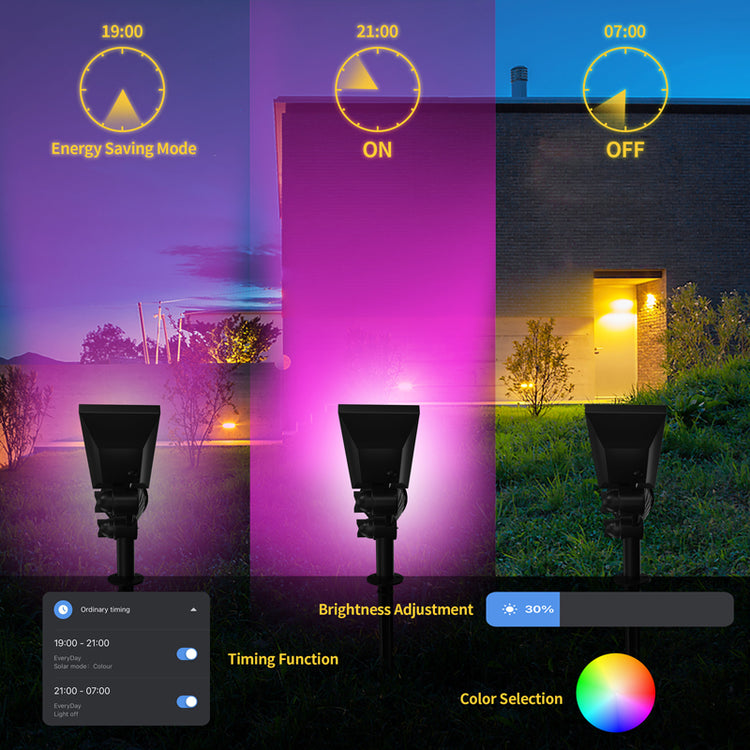 Smart rgb led solar lights has 16 million colors, you can set the colour or mode for each light individually. You also can set outdoor lights to turn on or off at specific time, and adjust the brightness between 1% and 100% to fit for different lighting scenarios.